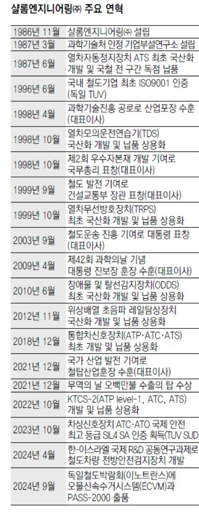 이 회사의 이야기는 1986년 11월로 거슬러 올라간다. 당시 철도청이 경부선 속도 향상을 위해 추진하던 열차자동정지장치(ATS) 국산화 프로젝트에 샬롬엔지니어링이 최초로 성공하며 철도 안전 산업의 문을 열었다.