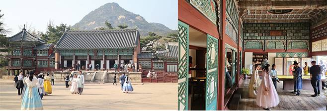 나들이 나온 상춘객들 사이로 감탄이 쏟아집니다. 전각 내부에 빽빽이 꽂힌 1700여 권의 책도, 호롱불을 연상케 하는 은은한 조명이 비추는 책상도 누구나 책 한 권 빼들어 읽고 싶게 만듭니다. 눈에 꽃풍경을 담기 바쁘던 나들이객들은 잠시 발걸음을 멈추고 책장을 넘기며 여유를 찾습니다. 왕은 이곳에서 무슨 생각을 했을까요, 잠시나마 역사 속 인물이 돼보는 상상도 즐깁니다.