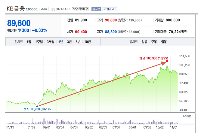 이 회사는 올해 초 PBR이 0.59에 못 미치는데도 자사주 매입 및 소각을 통해 주당 가치를 높이겠다는 계획을 발표했다. KB금융은 국민은행의 지주사로 745조3342억 원의 자산규모와 2024년 3분기 누적 약 7조 원의 영업이익을 기록하고 있다.