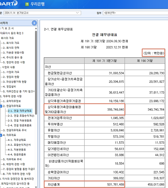 헷갈리지 말자. 2024년 3분기 기준 우리은행의 자산총계는 501조7614억 원과 부채 472조8381억원, 자본 28조9233억원이다.