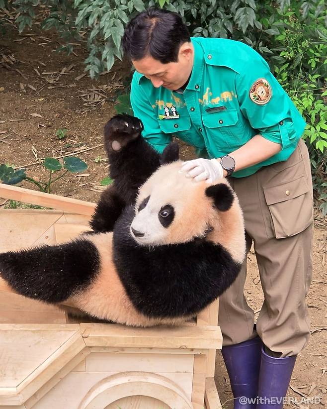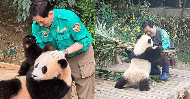 에버랜드 판다월드의 '송바오' 송영관 주키퍼와 막내 판다 후이바오는 바오 팬이라면 누구든 인정하는 사랑스러운 콤비입니다. 후이바오는 지금은 매우 발랄한 모습을 보여주고 있지만 아주 아기일 적에는 지금 모습은 상상할 수 없을 정도로 얌전했는데요. 이제는 송영관 주키퍼와 후이바오 둘 다 장난꾸러기 같은 모습으로 보기만 해도 절로 미소가 지어지는 '케미'를 보여주고 있죠.