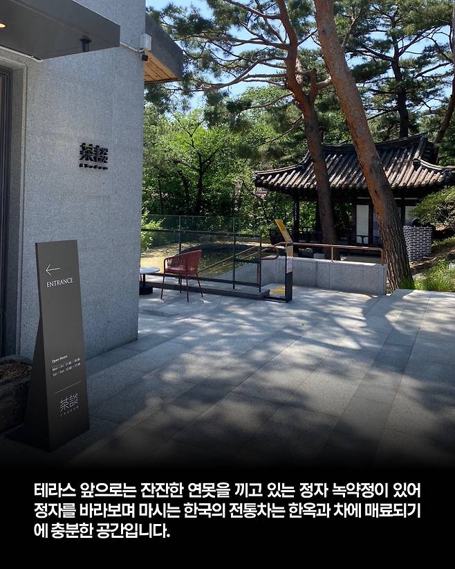 계단을 올라 내부에 들어서면 천장을 향해 모이는 서까래, 나뭇결을 살린 반듯한 테이블과 의자로 채운 고요한 내부 그리고 밖을 향해 활짝 열린 창과 테라스가 있는 공간입니다. 여름 한정 메뉴로 유기농 아쌈과 얼그레이티를 20시간 동안 냉침 해 계절 과일과 담아내는 아이스티 ‘과일 냉침 홍차’가 준비되어 있다고 하네요. 테라스 앞으로는 잔잔한 연못을 끼고 있는 정자 녹약정이 있어 정자를 바라보며 마시는 한국의 전통차는 한옥과 차에 매료되기에 충분한 공간입니다.