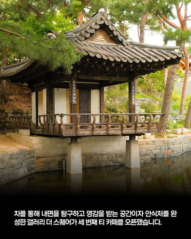 차를 통해 내면을 탐구하고 영감을 받는 공간이자 아늑한 안식처를 완성한 갤러리 더 스퀘어에서 세 번째 티 카페를 오픈했습니다. 정릉 국민대학교 명원박물관 내 해옹헌 1층에 자리한 ‘차담 by 갤러리 더 스퀘어’입니다. 명원박물관에 들어서면 한옥의 기와와 기왓골을 모티프로 한 회색 지붕의 큰 테라스가 있는 모던한 건물이 눈에 들어옵니다.