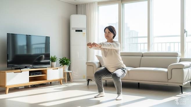 기마 자세는 스쿼트처럼 하체를 굽힌 상태로 버티며 실시하는 운동으로, 허벅지와 엉덩이 근육을 강하게 자극한다. 하체가 강화되면 근육 감소를 늦추는 데 유리하며, 코어까지 함께 활성화돼 허리에 가는 부담을 덜어주는 효과가 있다.