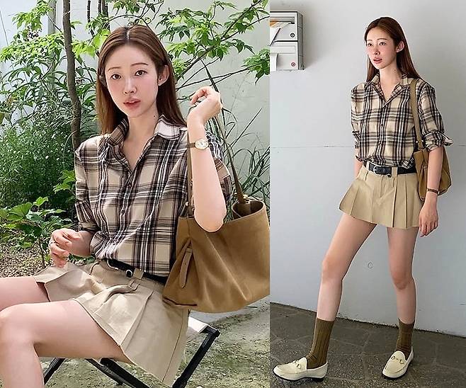 클래식한 브라운 체크 셔츠에 베이지 플리츠 미니 스커트를 매치해 단정하면서도 발랄한 분위기를 선보였습니다.