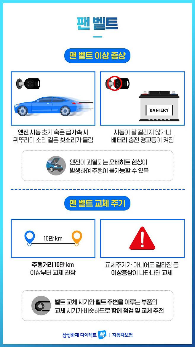 만일 팬 벨트 이상을 눈치채지 못하고 운행을 한다면 엔진이 과열되는 오버히트 현상이 나타나 주행이 불가능해지는 상황을 초례할 수 있습니다.