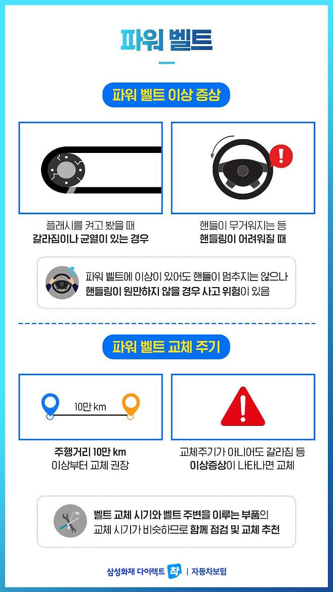 파워 벨트 역시 10만 km 이상 운행 시 교체하는 것을 권고하고 있으나 이상 증상이 없을 경우 꼭 해당 주기를 따를 필요는 없으며, 교체 시 주변부를 이루는 부품 역시 교체 시기가 비슷하므로 함께 점검을 받아 다 같이 교체하는 것을 권장 드립니다.