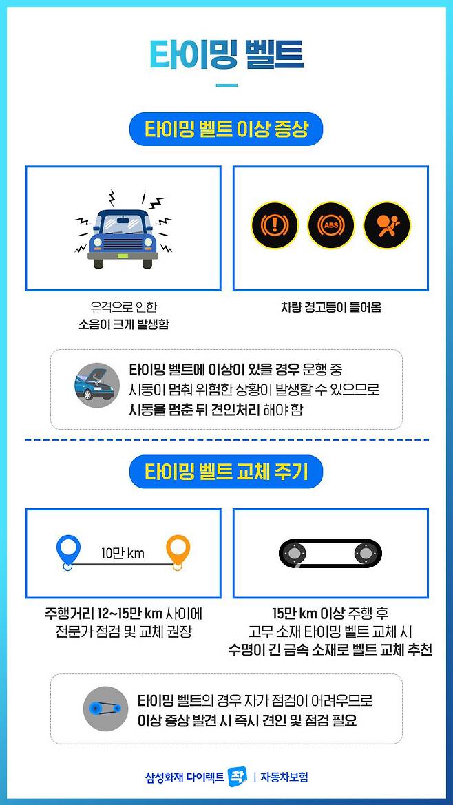 타이밍 벨트는 구동 벨트에 해당하는 팬 벨트&파워 벨트와 달리 자가 점검이 어려운 벨트인데요. 자동차에서 중요한 역할을 하는 벨트인 만큼 이상 증상을 예민하게 캐치하는 것이 중요합니다. 타이밍 벨트에 문제가 있을 경우 유격으로 인한 소음이 크게 발생하고 차량에 경고등이 들어오는 등의 이상 증상을 보이는데요. 타이밍 벨트는 자동차에서 중요한 역할을 하고 있는 만큼 큰 사고로 이어질 수 있으므로 이상 증상이 나타날 경우 시동을 즉시 멈추고 견인처리를 해야 합니다.