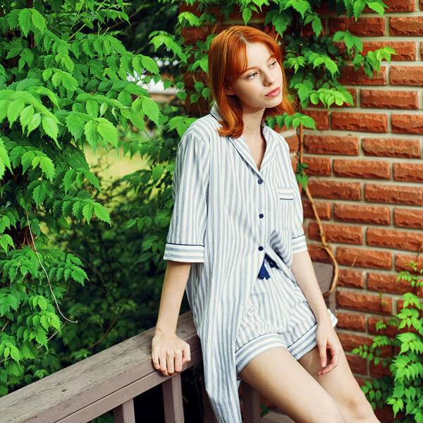 100% 코튼으로 자극 없는 소재를 사용하여 가벼운 포근함과 부드러움이 뛰어난 잠옷. 촉감이 시원한 면 잠옷으로 여름에 착용하기 좋다. 디자인은 원피스이나 안에 있는 하의로 다양한 무드를 연출할 수 있으며, 원피스가 말려 올라갈 걱정 또한 없다. 멜란지 스카이블루 색상의 세련된 스트라이프와 딥네이비 컬러의 단추로 포인트를 준 디자인으로 홈웨어가 아닌 일상복 같은 느낌이라 잠깐 밖에 외출도 가능하다. 같은 디자인의 긴팔 버전인 롱 세트도 있으니 원하는 대로 구매가 가능하다.