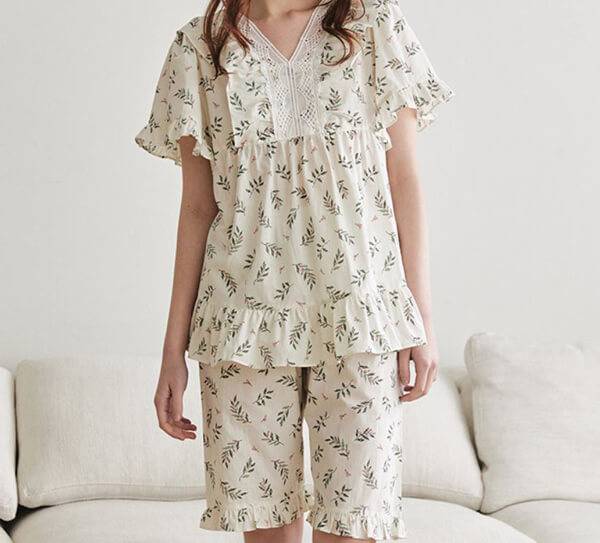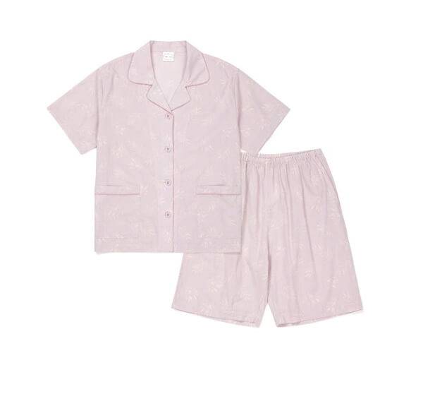 퍼플 그레이 색상의 잠옷으로 러블리함과 시원함을 동시에 가져가는 제품이다. 은은하게 더해진 야자 나뭇잎의 패턴이 답답하지 않게 들어가 있어 밋밋한 느낌을 없애준다. 100% 면으로 제작되어 얇고 가벼우며 통기성이 좋아 여름에도 시원하게 입을 수 있다. 워싱 가공을 통해 소재 표면이 부드럽고 내추럴하며 소프트한 터치감으로 촉감이 매우 좋은 편이다. 반소매뿐 아니라 원피스 형태의 여성 홈웨어도 있어 선택의 폭이 넓다.