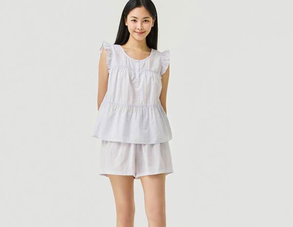 면 100%의 고밀도 60수 순면 소재라서 더욱더 부드럽게 착용이 가능하며 흡수성 또한 탁월하여 땀이 많이 나는 열대야에 좋은 제품이다. 색상은 크림, 아이보리, 블루, 네이비 총 4가지의 색상이며, 자수가 은은하게 놓인 원단으로 상의에 달린 프릴과 함께 러블리함을 더해준다. 섬유를 하얗게 보이게 하는 형광 증백제를 사용하지 않는 무형광 원단으로 피부에 안전하다. 목뒤에 부착되어 있는 라벨을 제거하여 꺼끌거림 없이 편안하게 착용 가능하다.