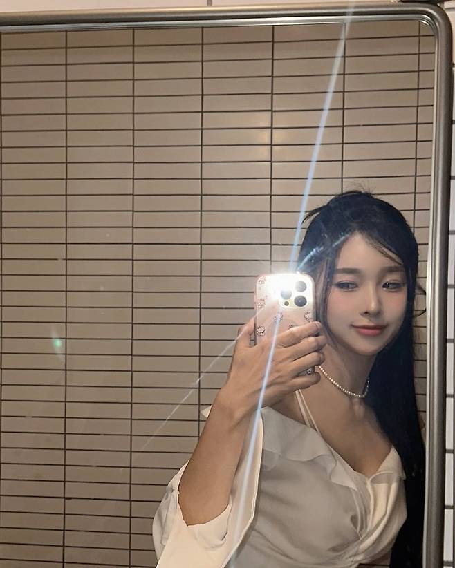 한초임처럼 깔끔한 톤온톤 조합으로 자신만의 감각적인 미러 셀카룩을 시도해보는 건 어떨까.
