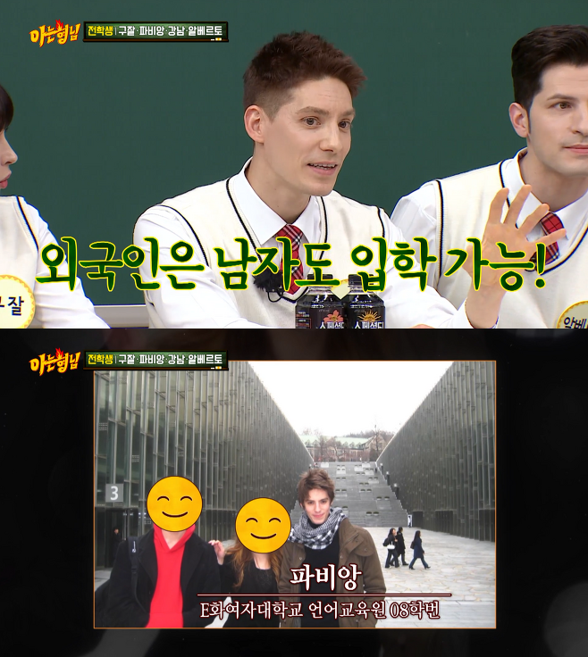 여대라서 여성들만 이대 출신이라고 생각하는 분들이 계실 텐데요. 놀랍게도 이대 나온 남자도 있습니다. 바로 프랑스 출신의 방송인 파비앙인데요, 파비앙은 2008년 이화여대 언어교육원에 한국어 수업을 받은 '이대나온 남자'입니다.
