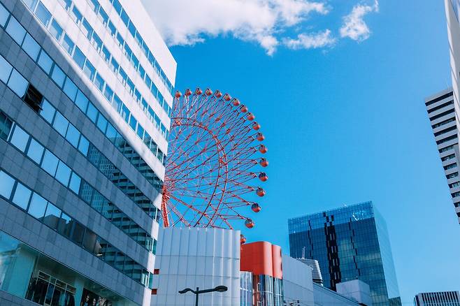 우메다의 중심부에 위치한 복합 상업 시설 햅 파이브는 10~20대 여성을 위한 패션이나 레스토랑, 놀이시설 등 약 170개 이상의 상점이 모여 있는 오사카 랜드마크인데요. 특히 햅 파이브의 상징이라할 수 있는 새빨간 관람차는 지름만 약 75m나 되며, 한 바퀴 도는데 약 15분이 걸릴 정도로 거대하죠.