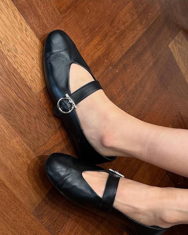 발등을 얹는 버클 스트랩 플랫 슈즈는 포멀한 구조와 부드러운 라운드 쉐입이 매력적이고, 블랙 미니백으로 고급스러운 마무리를 더했어요.