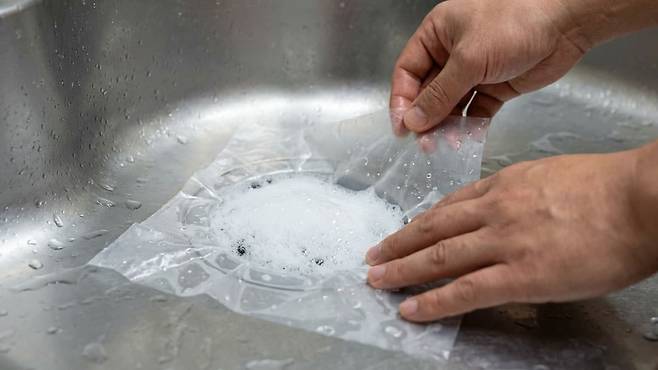 휴지를 넣은 배수구에 과탄산소다 1컵을 붓고, 40~60도의 따뜻한 물 1리터를 천천히 부어준다. 하얀 거품이 올라오기 시작하면 배수구 전체를 비닐봉지로 덮어 공기가 빠져나가지 않도록 눌러준다. 이 상태로 5~10분 정도 두면 압력이 높아진 거품이 배수관 벽면 구석구석까지 밀착되며 악취의 원인을 말끔히 제거한다.