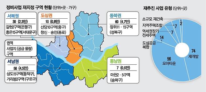 권역별로 노후 저층 주거지와 준공업지역이 밀집한 동북권(60곳)과 서남권(56곳)에 정비사업 구역 재지정이 집중됐다. 서북권에선 30곳이 되살아났고, 동남권에서도 7곳이 다시 기회를 얻었다.