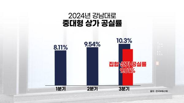 한국부동산원 부동산통계정보시스템 따르면 지난해 3분기 강남대로 중대형 상가 공실률은 10.3%였습니다. 1분기 8.11%, 2분기 9.54%에 이어 3분기 연속 상승했는데요. 같은 시기 집합 상가 공실률도 9.01%에 달해 서울 내에서도 높은 수준입니다.