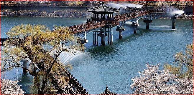 낙동강 물 위로 길게 뻗은 국내 최장 목책 인도교, 월영교는 댐 건설로 수몰된 월영대의 이름을 이어받아 만들어졌습니다.이곳엔 한 편의 애틋한 사랑 이야기가 깃들어 있습니다.