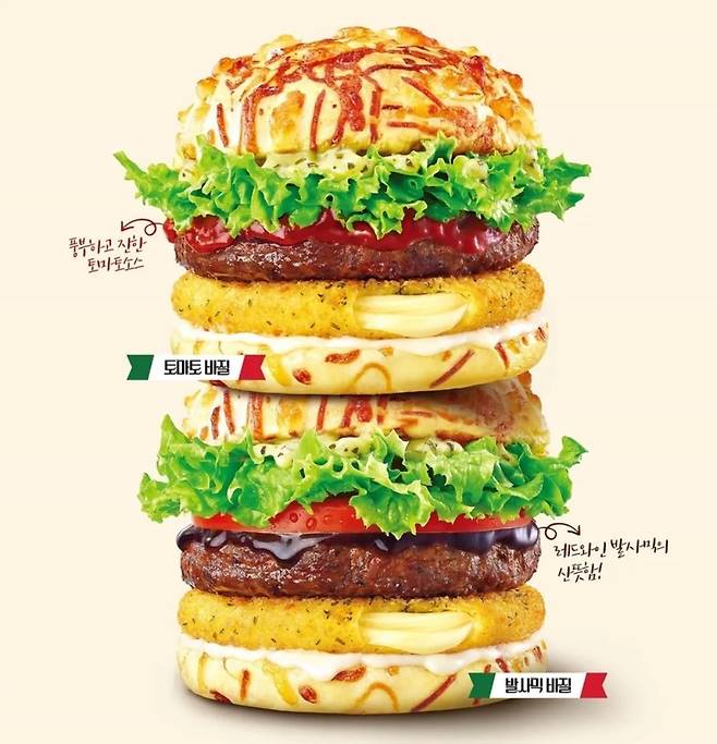 흑백요리사 우승자 나폴리 맛피아가 롯데리아 햄버거를 만들었다. 정통 이태리의 맛을 버거에 어떻게 표현했을까. 이름은 ‘나폴리맛피아 모짜렐라버거’인만큼 이탈리아산 모짜렐라 치즈 패티를 넣었다. 번은 브리오쉬 번에 모짜렐라와 체다 치즈를 올려 풍미를 더했다. 토마토 바질, 발사믹 바질 2종 중에 고를 수 있다. 묘하게 피자 맛이 나는 햄버거를 맛볼 수 있다.