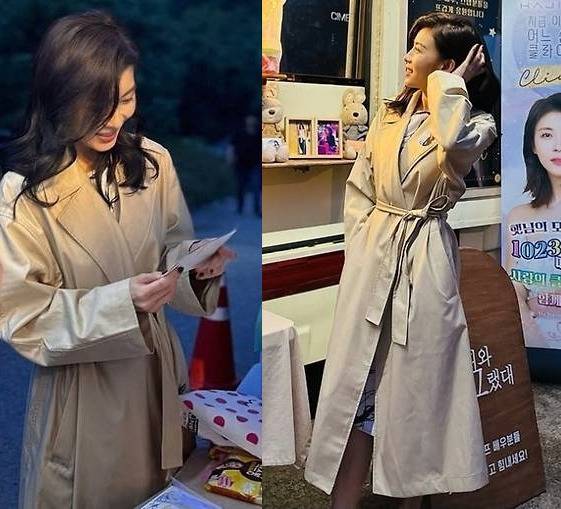 하지원은 클래식한 디자인의 라이트 베이지 컬러 트렌치코트를 착용해 단번에 시선을 끌었습니다.