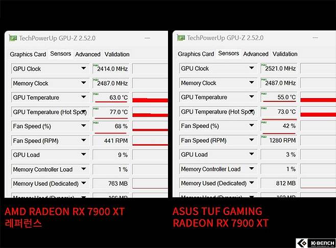 실제, ASUS TUF GAMING RADEON RX 7900 XT와 레퍼런스 제품의 온도를 비교하면 GPU 온도가 8도나 낮게 측정된다. GPU 내부의 핫스팟 온도도 4도나 내려간다.