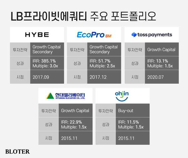 LB PE의 투자 포트폴리오를 들여다보면 엔터·IT·제조부터 유통업까지 폭넓은 산업에 걸쳐 있다. LB PE는 하이브에서 385.1%라는 기록적인 내부수익률(IRR)을, 에코프로비엠에서는 투자원금대비(MOIC) 2.5배 이상의 수익을 기록하며 트랙레코드를 쌓아왔다. 이외에도 △토스페이먼츠 △현대엘리베이터 등의 기업에 그로쓰캐피탈(성장형 투자) 투자를 단행해 성과를 냈다.