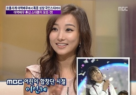 연예계 최연소 교수로도 유명한 배우 이인혜. 평양검무 인간문화재인 임영순 여사의 딸로 초등학교 5학년이던 1991년 MBC 어린이 합창단으로 처음 연예계에 데뷔하게 된다.