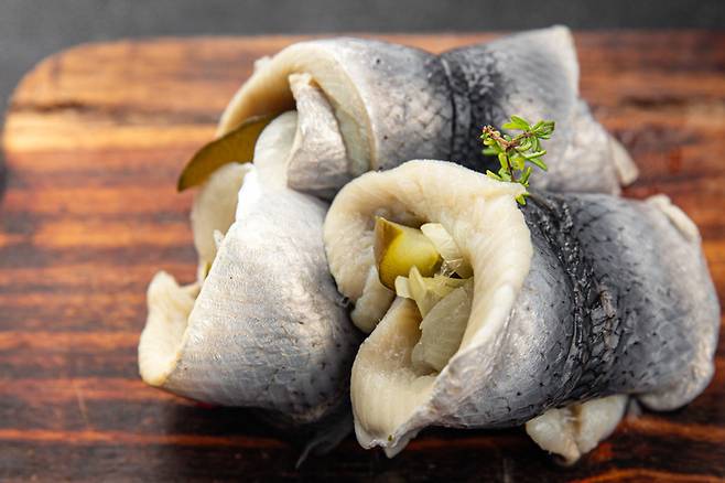 북유럽에서 시작해 독일 전역으로 퍼진 롤몹스는 말린 청어를 양파와 오이피클로 속을 채워 원통형으로 말아 만든 전통 음식으로, 특유의 신맛과 짠맛의 조화가 특징이다. '카터프뤼슈튀크(Katerfrühstück)'라 불리는 독일식 해장 식사의 일부인 롤몹스는 소금 성분으로 전해질을 보충하고 수분 공급과 함께 청어의 오메가-3 지방산이 간 기능 회복을 돕는다. 부드러운 청어와 아삭한 오이피클의 식감의 풍미는 해장을 넘어 미식가의 입맛도 사로잡는다.