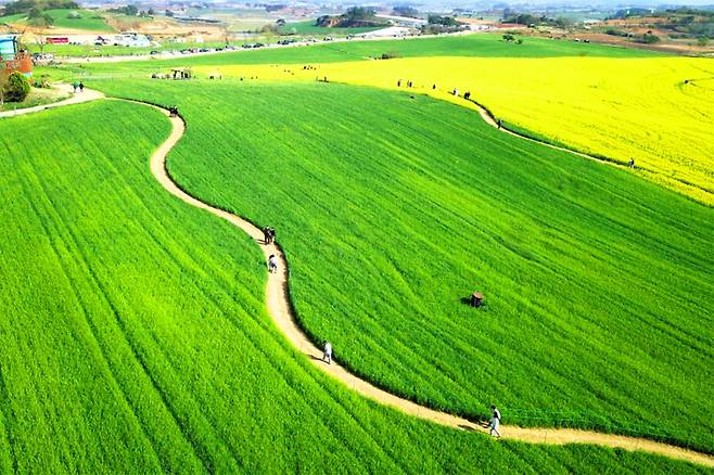 특히 청보리의 초록 물결과 함께 유채꽃의 노란 향연도 즐길 수 있어 색감 대비가 돋보이는 이색 풍경을 감상할 수 있다.