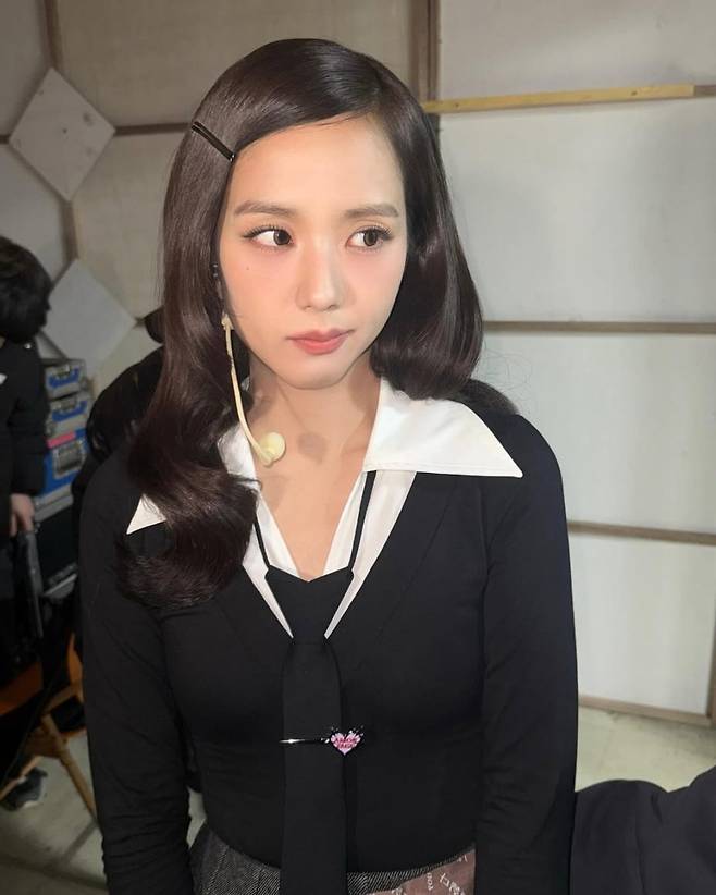 이렇게 깻잎 머리가 우아하고 여성스러울 수 있다니 역시 지수 다운 스타일링이 닐까 싶어요 상위는 셔츠에 니트 레이어드 같은데 보니까 바디슈트 더라고요.