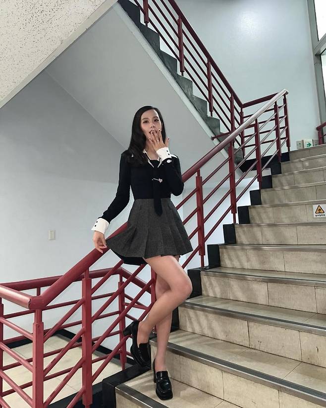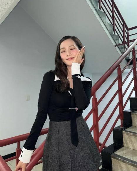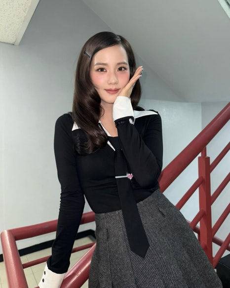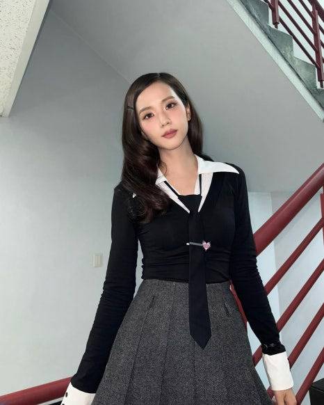 그레이 미니 플리츠 스커트의 화이트 셔츠와 레이어드한듯한 바디 슈트를 매치하고 블랙 넥타이로 포인트를 주어 고급스러우면서도 클래식한 분위기를 연출했습니다.