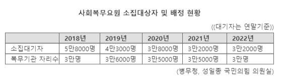7일 병무청이 성일종 국민의힘 의원실에 제출한 자료에 따르면 지난해 장기 대기를 하다 복무 면제 처분을 받은 4급 보충역은 1만740명에 달한다. 장기 대기에 따른 사회복무요원 면제자 수는 2016년 11명·2017년 90명 수준이었지만 2018년 2317명·2019년 1만1457명·2020년 1만5331명·2021년 1만4485명으로 급증했다. 매년 1만명 넘는 청년들이 대기만 하다 면제 처분을 받고 있는 셈이다.