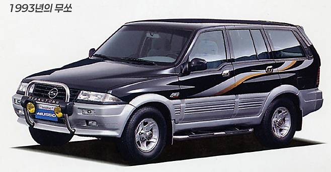 1993년에는 쌍용에서 코란도 패밀리의 후속 모델이면서 차체를 더 키운 대형급 SUV로 무쏘(FJ)가 등장합니다. 무쏘는 코뿔소의 순 우리말 이름 ‘무소’에 된소리를 더해 강한 이미지를 준 이름입니다. 무쏘는 벤츠제 5기통 디젤 엔진과 6기통 가솔린 엔진에 벤츠 변속기를 결합한 동력장치를 가지고 있었습니다. 무쏘의 차체 디자인은 영국의 왕립예술대학(RCA) 산업디자인학과 교수 켄 그린리(Ken Greenly)에 의해 진행된 것으로 알려져 있습니다.