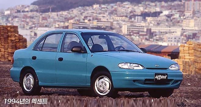 1994년에는 엑셀의 후속 모델로 엑센트(Accent)가 등장합니다. 2세대 엑셀이 직선적 형태였던 것에 비해 엑센트는 곡면과 곡선을 강조한 귀여운 이미지에 더 젊은 소비자를 겨냥한 차로 등장했습니다. 차체 색도 파스텔 색조를 쓰는 등 감성을 강조했습니다.