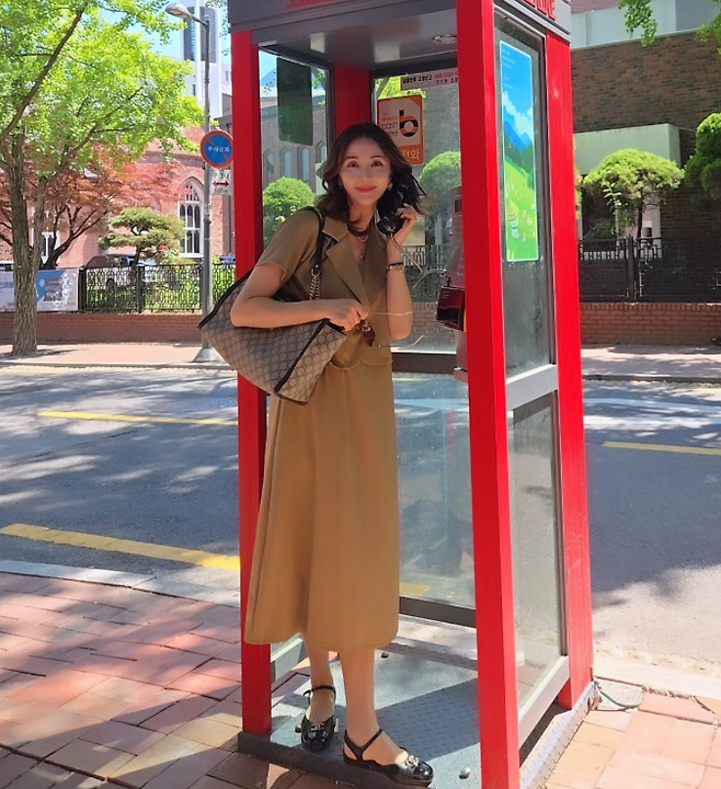윤해영은 고급스럽고 클래식한 스타일을 자주 선보인다. 최근에는 베이지 롱원피스를 착용해 우아하고 세련된 분위기를 자아냈다. 이 원피스는 고급스러움과 깔끔함을 동시에 보여주는 디자인으로, 그녀의 몸매를 아름답게 드러냈다. 또한, 선글라스를 착용하여 여유롭고 세련된 느낌을 더하며, 클래식한 베이지 가방으로 톤온톤의 패션을 완성했다.
