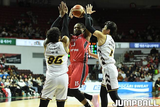 [점프볼=안양/유용우 기자] 11일 안양 정관장 아레나에서 열린 2024-2025 KCC 프로농구 정규리그 안양 정관장과 창원 LG의 경기, 정관장 버튼의 공격을 LG 먼로와 유기상이 수비하고 있다.