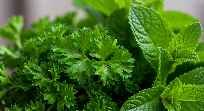 파슬리와 민트는 천연 구강청정제 역할을 합니다. 파슬리에 함유된 클로로필은 냄새를 중화시키는 효과가 뛰어나며, 민트의 멘톨 성분은 즉각적인 상쾌함을 선사합니다. 식사 후 몇 잎을 씹거나 요리에 활용하면 자연스럽게 입 냄새를 관리할 수 있습니다.