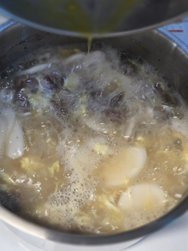 육수가 우러나고 물이 팔팔 끓기 시작하면 풀어둔 계란을 천천히 부어주고