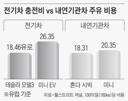 28일 월스트리트저널에 따르면 독일에선 100마일(160㎞)당 전기차 충전 비용(급속 충전 기준)이 내연기관차의 주유 비용을 넘었다. 테슬라 모델3의 충전 비용은 100마일당 18.46유로(약 2만4900원)로, 동급 내연기관차인 혼다 시빅의 주유비(18.31유로)보다 비싸다. 또 동급 차량인 BMW 계열사 미니의 전기차(26.35유로)와 내연기관(20.35유로), 현대차 코나 전기차(22.95유로)와 내연기관차인 닛산 로그(19.97유로) 비교에서도 내연기관차 주유 비용이 더 저렴한 것으로 나타났다.