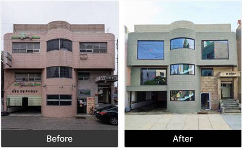 상업용 건물인 만큼 임차인을 돋보이게 하기 위한 설계도 필요했다. 김 대표는 건물에 나있던 창문 높이를 각각 2배 정도 키우는 방식을 택했다. 김 대표는 “가장 큰 창문을 기준으로 높이를 약 1m 정도 키웠다”며 “도로를 지나는 사람들이 건물을 바라볼 때 매장 안까지 들여다보면서 흥미를 느낄 수 있는 시각적 유인 효과를 극대화했다”라고 했다. 때가 탄 듯한 분홍색 타일이 붙어 있던 외관은 벽돌을 쌓아 새로 마감할 계획이었지만, 비용 최소화를 고려해 밝은 회색 페인트로 칠하는 것으로 마무리했다.