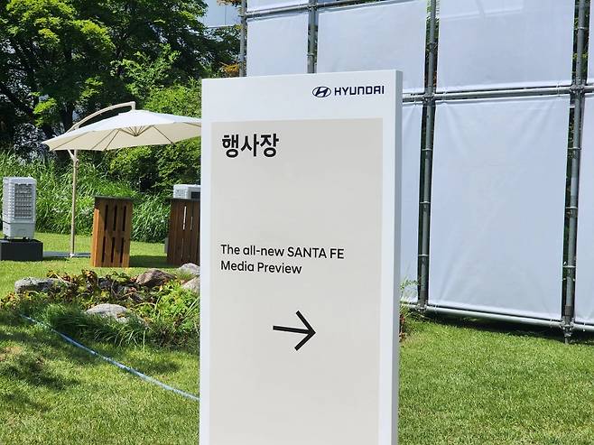 행사장에 도착하니 실루엣을 살짝 가려놓은 가림막 아래에 있는 5세대 싼타페가 보입니다. 제가 공개된 이미지로 예상되는 걸 정리한 이전의 포스팅이 있긴 하지만 이는 순수하게 저의 주관적인 예측으로 작성한 글이였고 복날에 공개 예정인 상세한 가격표와 확정된 사항들이 공개될 것이기에 아무런 자료조사없이 그냥 갔습니다.