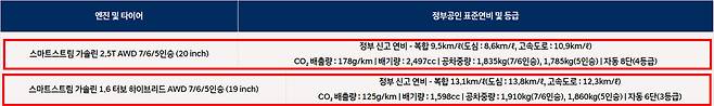 일단 이전 모델의 경우 2.5T 모델(20인치, 1,835kg)과 1.6T 하이브리드 모델(19인치, 1,910kg)의 공차중량을 비교해보면 75kg 차이가 난다는 걸 볼 수 있습니다. 동일한 휠 크기로 비교하자면 대략 100kg 차이가 난다는 점 알려드립니다.