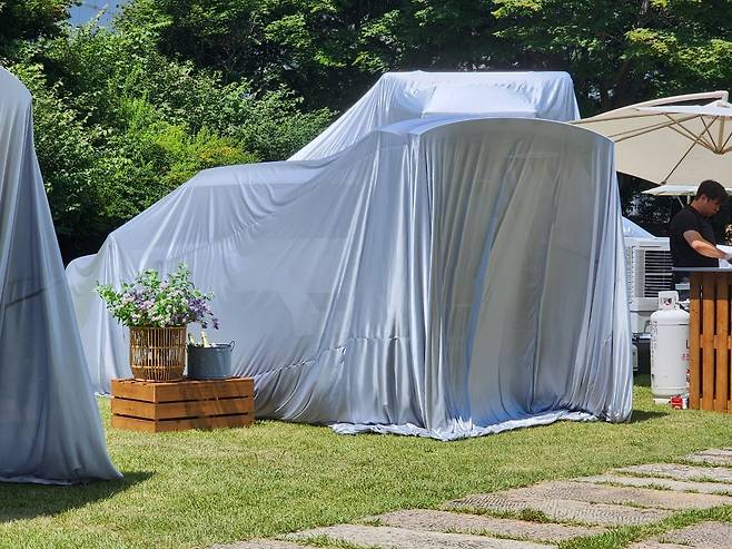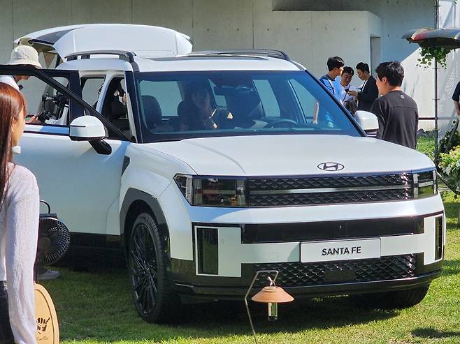 행사장에 도착하니 실루엣을 살짝 가려놓은 가림막 아래에 있는 5세대 싼타페가 보입니다. 제가 공개된 이미지로 예상되는 걸 정리한 이전의 포스팅이 있긴 하지만 이는 순수하게 저의 주관적인 예측으로 작성한 글이였고 복날에 공개 예정인 상세한 가격표와 확정된 사항들이 공개될 것이기에 아무런 자료조사없이 그냥 갔습니다.