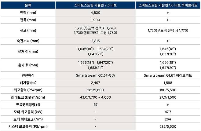 도심주행이 많지 않고 평소 원활한 곳에서 주행을 하는 분들이나 주말 레저용으로 생각하시는 분들이라면 이야기가 달라집니다. 특히 주행 하는 감각 그 자체에 민감하시다면 역시나 출력이 더 좋은 2.5 가솔린 터보 모델을 권장드리고 싶고 구동 방식은 AWD를 권장드리고 싶습니다.