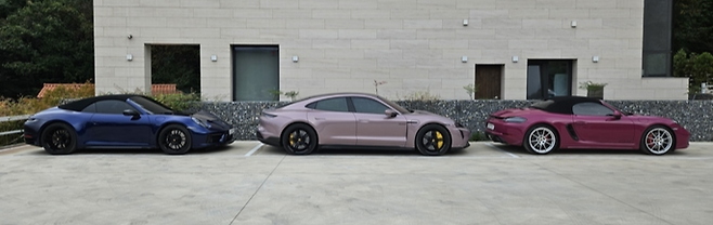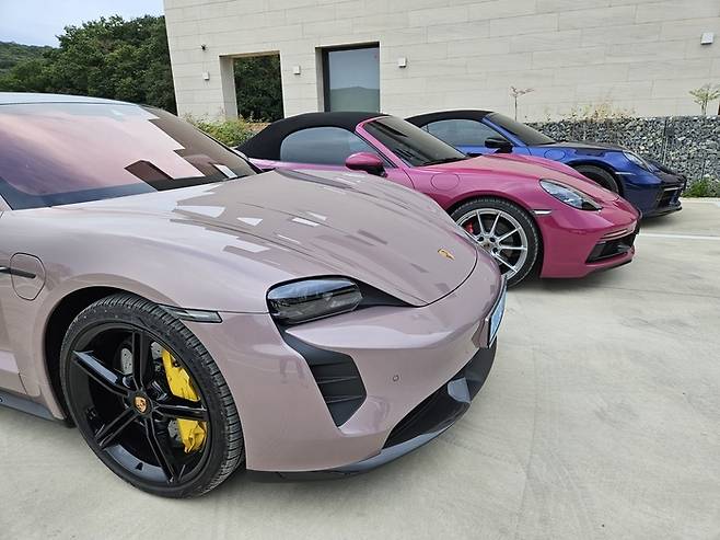 718, 타이칸, 911등 포르쉐 대표 모델의 운전석에 앉아 극한의 주행 성능에 감탄하기도 잠시, 검은 아스팔트 위 흰색·검정색·회색 등 무채색 차량들을 지나는 동안 관심은 다른 곳으로 옮겨 갔다. 시선이 꽂힌 곳은 앞유리 너머로 보이는 보닛 끄트머리와 좌·우 사이드미러에 비치는 차량 측면부. 생소한 이름의 색을 입은 포르쉐가 바깥에선 어떤 모습일지 보고 싶었다.