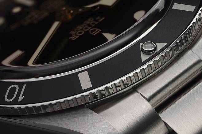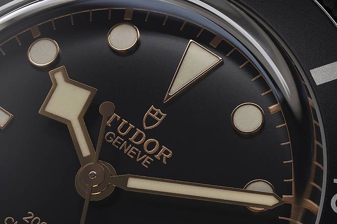미세한 돔 형태의 블랙 다이얼에 금색 글자로 브랜드명과 로고를 비롯해 여러 정보를 적었습니다. 1969년에 도입된 이래 튜더의 다이버 워치를 상징하는 스노우플레이크 시침을 그대로 사용했습니다. 앞서 소개한 블랙 베이 버건디와 마찬가지로 롤리팝 초침을 설치했습니다. 슈퍼루미노바를 칠한 바늘과 인덱스를 이용해 깊은 물속에서도 어렵지 않게 시간을 확인할 수 있습니다.