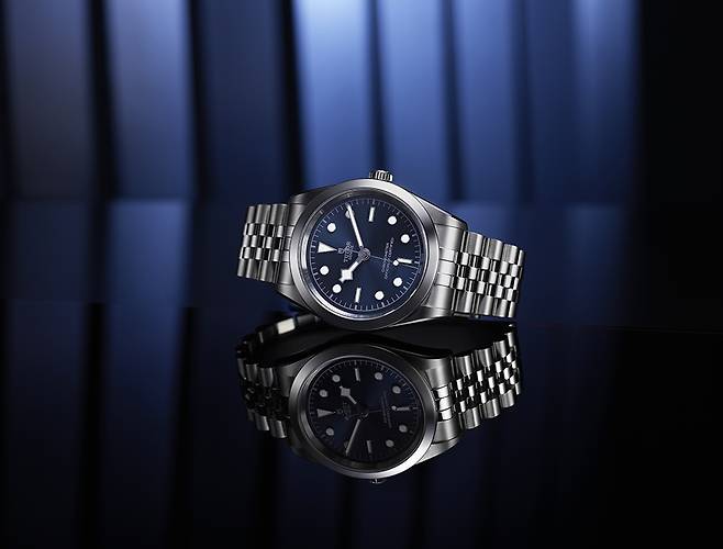 다이얼 색상은 블루, 샴페인, 그레이입니다. 도트 인덱스에 다이아몬드를 세팅해 고급스러움을 추구한 모델도 같이 선보입니다. 인덱스 디자인, 스노우플레이크 핸드, 크로노미터 문구 등 블랙 베이 컬렉션의 DNA를 공유합니다. 단, 날짜 기능은 없습니다.