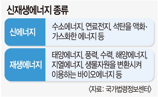 신재생 에너지는 ‘신 에너지’와 ‘재생 에너지’가 합쳐진 용어다. 신 에너지는 기존에 쓰이던 화석연료가 아닌, 수소 에너지와 연료 전지 등을 말한다. 재생 에너지는 고갈되지 않고 지속적으로 얻을 수 있는 에너지를 뜻한다. 태양광·풍력 등 자연 에너지를 변화해 이용하거나, 폐자원을 재활용해 에너지를 생성하는 경우다.