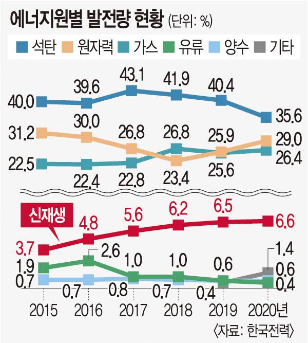 하지만 가야 할 길은 여전히 멀다. 한국전력공사 전력통계에 따르면, 신재생 에너지 비율은 2020년 기준 6.6%밖에 안 된다. 2018년 6.2%, 2019년 6.5%, 2020년 6.6%로 거의 늘지 않고 있다. 반면 영국·독일·이탈리아는 해당 비율이 40%에 육박하며, 일본은 18%, 미국 17%, 프랑스 20%에 달한다.